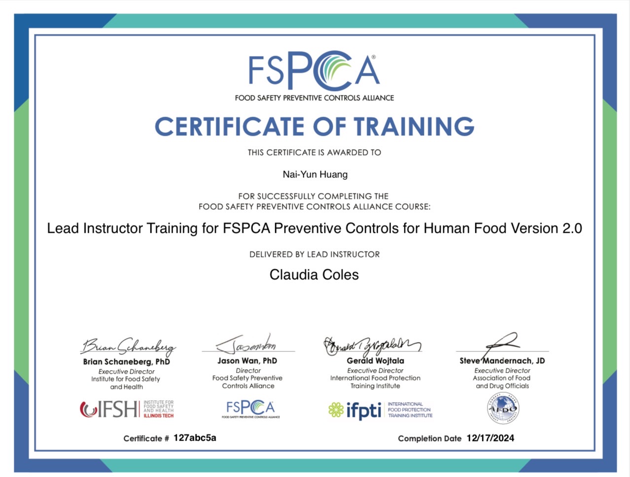 - 國際HACCP聯盟(International HACCP Alliance)主導訓練師