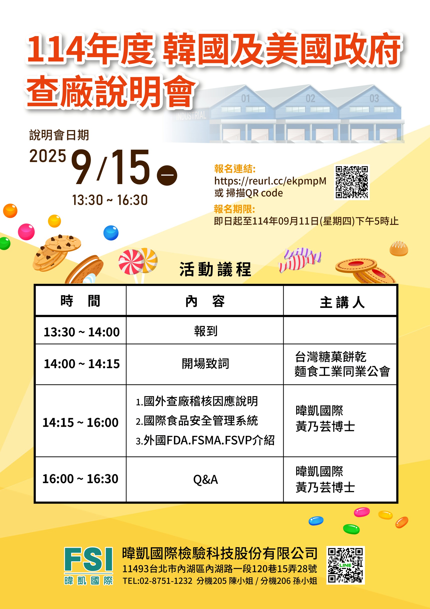 一、目的: 為協助我國食品業者因應韓國及美國政府來台查廠之需求,提供工廠對國外法規要求的應對能力, 本單位特舉辦 「國外政府來台查廠說明會」。本次說明會解析韓國及美國FDA查廠需要注意的事項,並解說2025年美國FDA常開的缺失。 二、主辦單位:暐凱國際檢驗科技股份有限公司。 三、協辦單位:台灣糖菓餅乾麵食工業同業公會。 四、邀請對象:食品相關業者。 五、費用:免費。