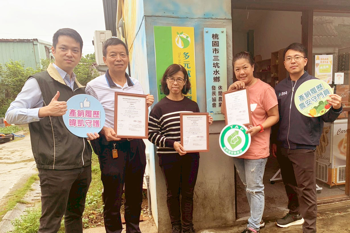 桃園市農業局科員張元齊(右起)、農友李雪鳳、三坑水鄉休閒農業發展協會理事長徐美惠、農友李廖財與暐凱驗證經理王鵬翔於產銷履歷驗證授證時合影。(圖/FSI暐凱國際提供)