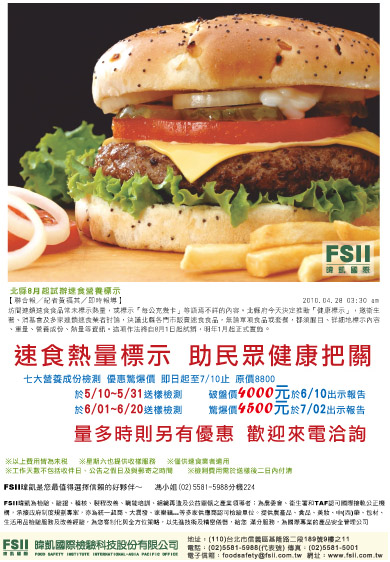 | 2010-07-02 | 速食熱量標示 助民眾健康把關 |