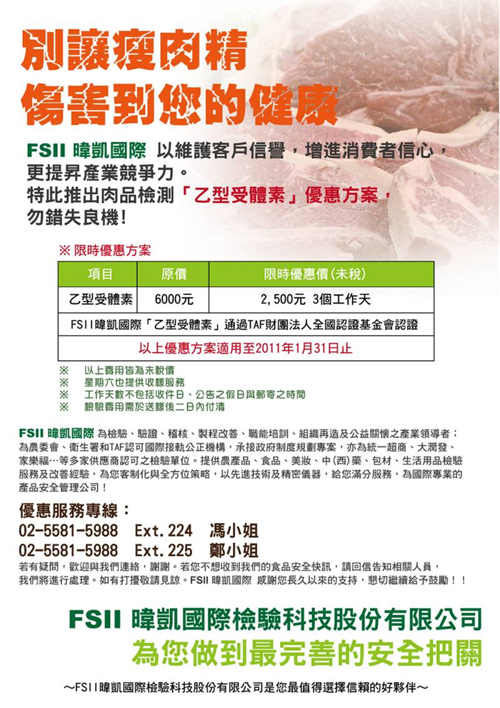 別讓瘦肉精傷害到您的健康 FSII暐凱國際檢驗為您做到最完善的安全把關 FSII暐凱以維護客戶信譽,增進消費者信心,更提昇產業競爭力。 榮獲〝行政院衛生署〞及〝TAF〞頒發之「食品衛生委託機構核定證書」 提供你最專業的檢驗,為您嚴格把關。 特此推出肉品檢測「乙型受體素」優惠方案,勿錯失良機! ※ 限時優惠方案