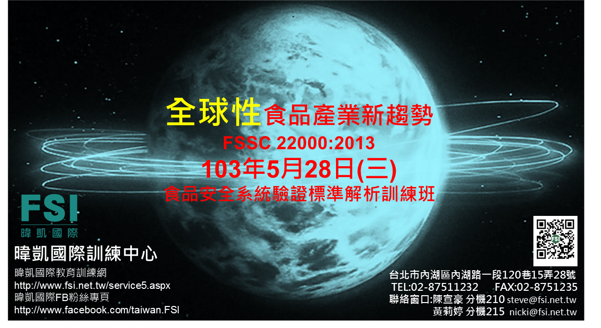 | 2014-05-01 | 【FSI 暐凱國際-食安學院】食品產業新趨勢,強化食品安全管理,促進食品供應鏈效能 |