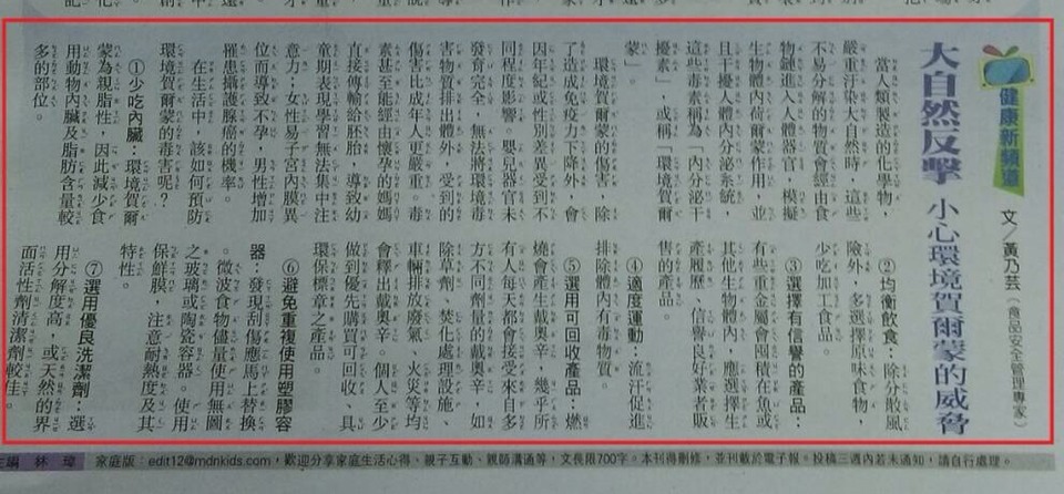 | 2015-09-17 | 黃博士於國語日報分享「大自然反擊 小心環境賀爾蒙的威脅」 |