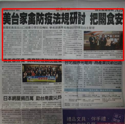 | 2016-04-20 | 經濟日報:FSI暐凱何中平 博士參與美台家禽防疫法規研討會,把關食安 |