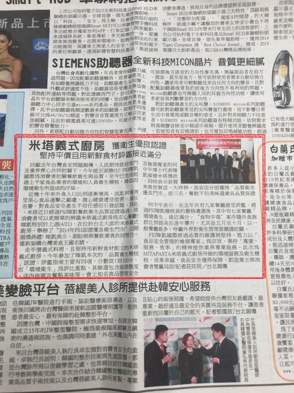FSI暐凱【米塔義式廚房榮獲衛生優良認證】報導於中華時報
