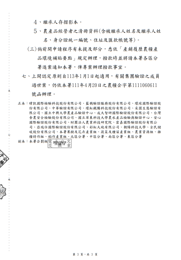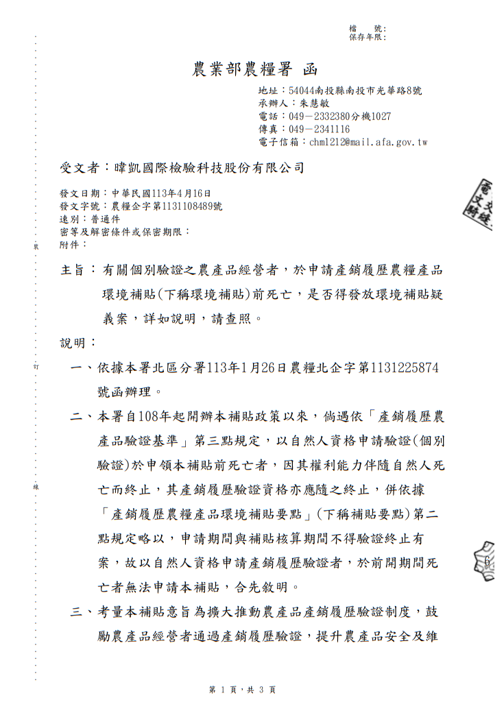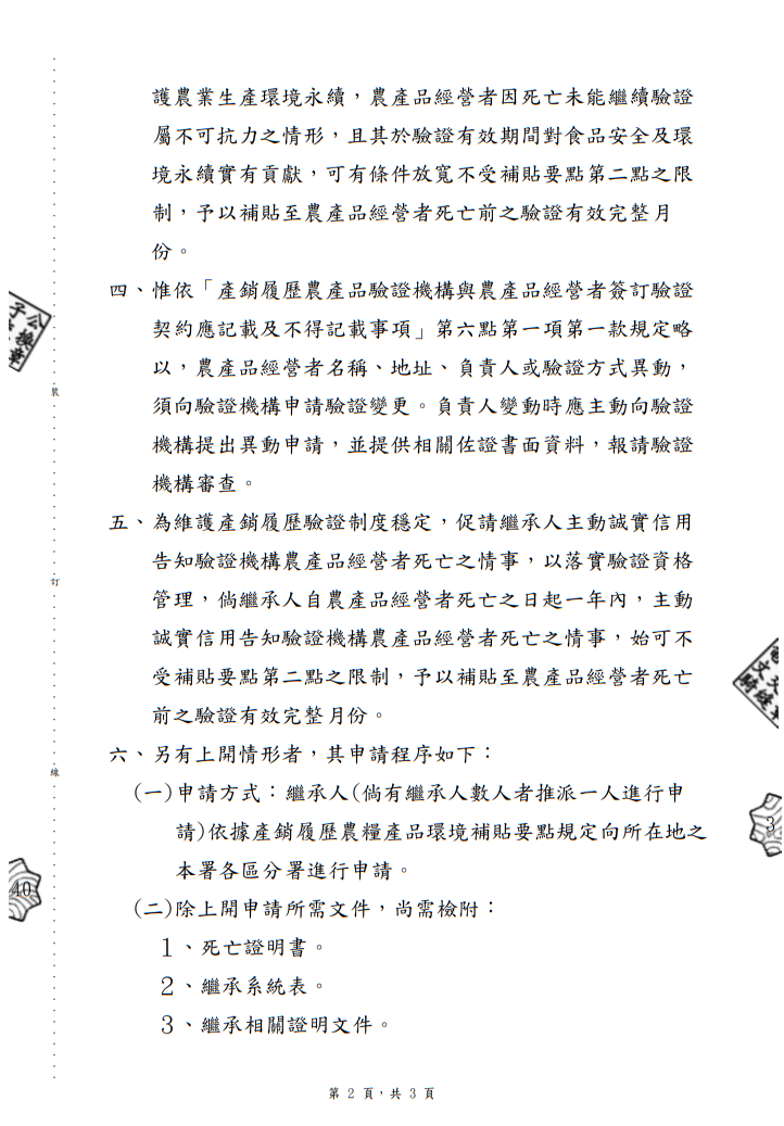 <轉知>有關個別驗證之農產品經營者,於申請產銷履歷農糧產品環境補貼前死亡,是否得發放環境補貼疑義案,詳如說明