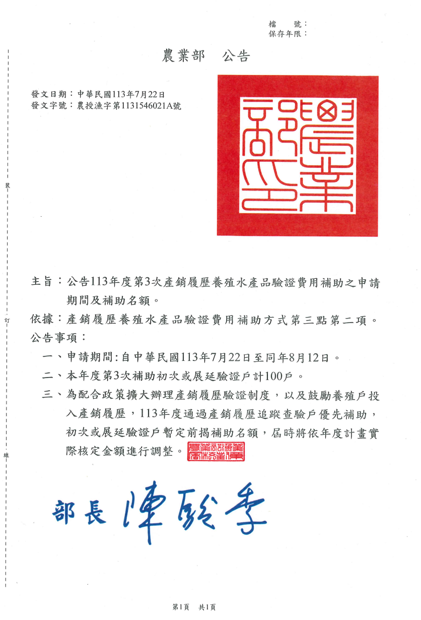 【轉知】農業部公告「一百十三年度產銷履歷養殖水產品驗證費用補助之申請補助期間及補助名額」