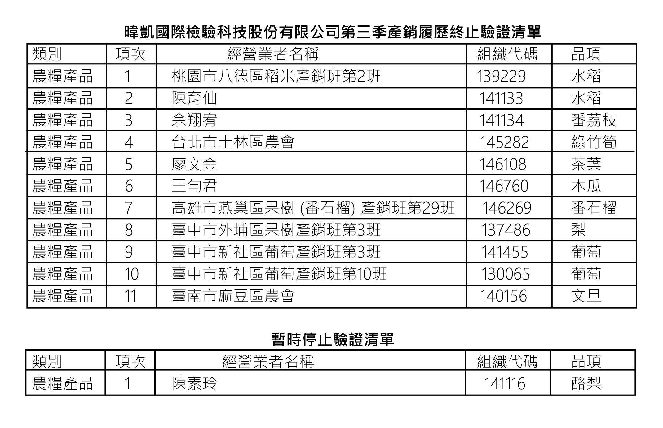 113年第三季產銷履歷終止/暫時停止驗證名單