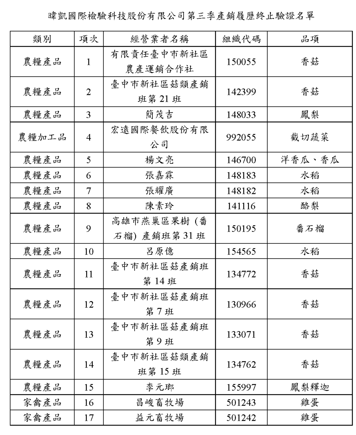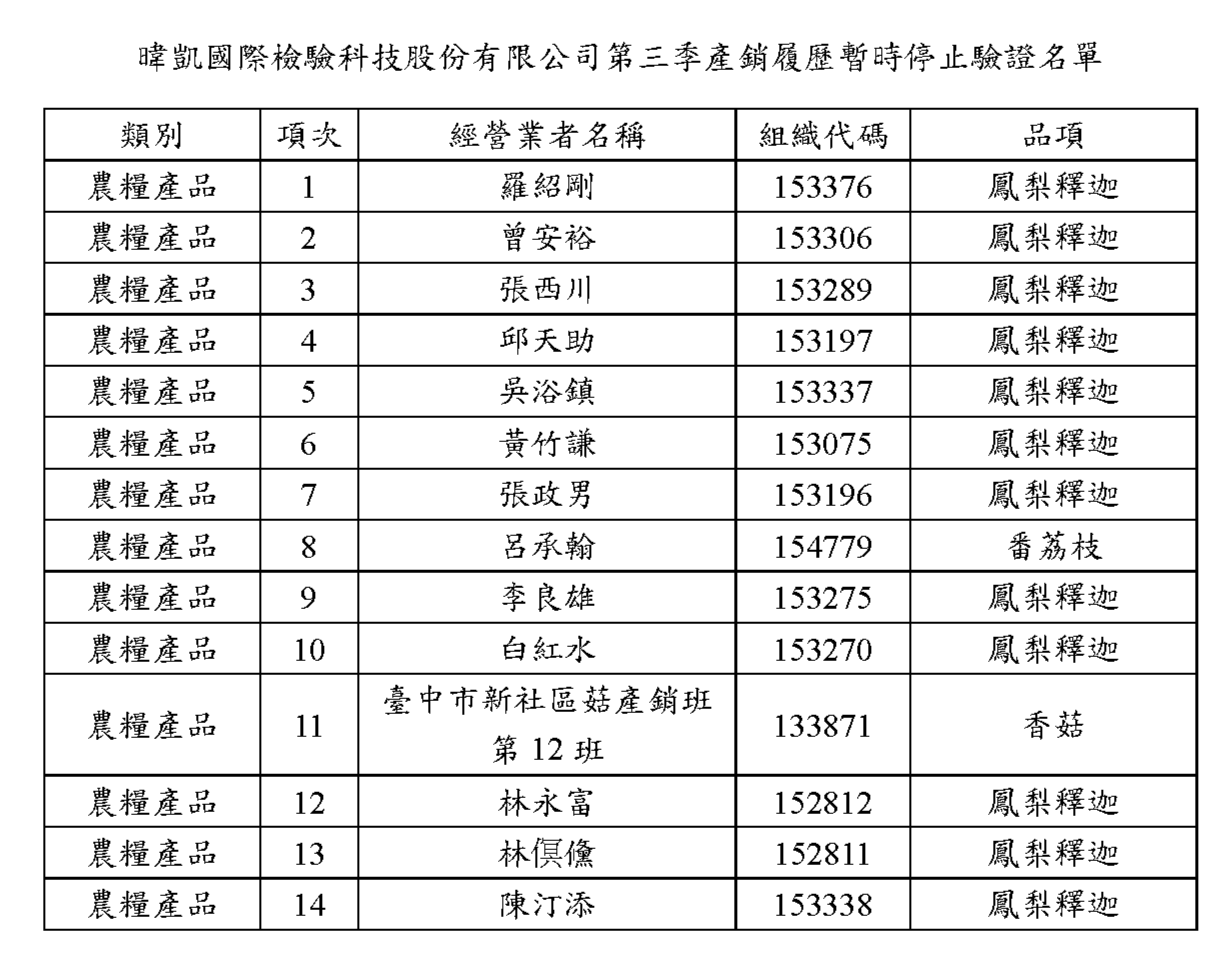 114年第三季產銷履歷終止/暫時停止驗證名單