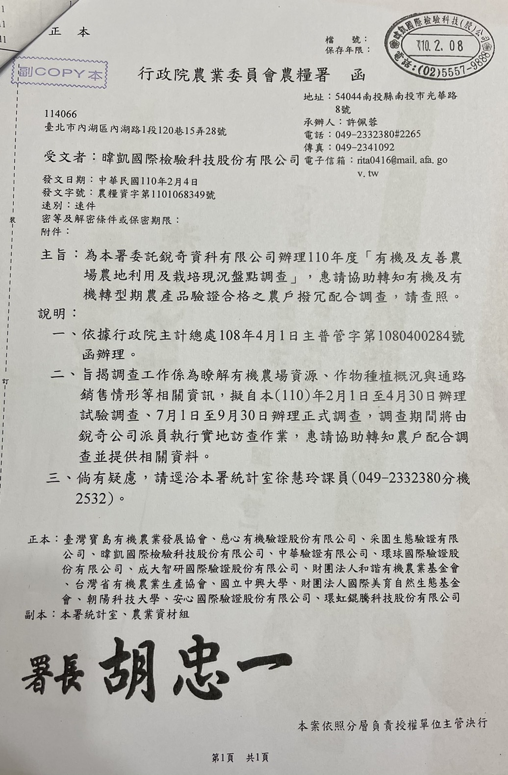 行政院農業委員會農糧署公告 行政院農業委員會農糧署委託銳奇資料有限公司辦理110年度「有機及友善農場農地利用及栽培現況盤點調查」,惠請有機及有機轉型期農產品驗證合格之農會撥冗配合調查 自110年2月1日至4月30日辦理試驗調查 110年7月1日至9月30日辦理正式調查 |