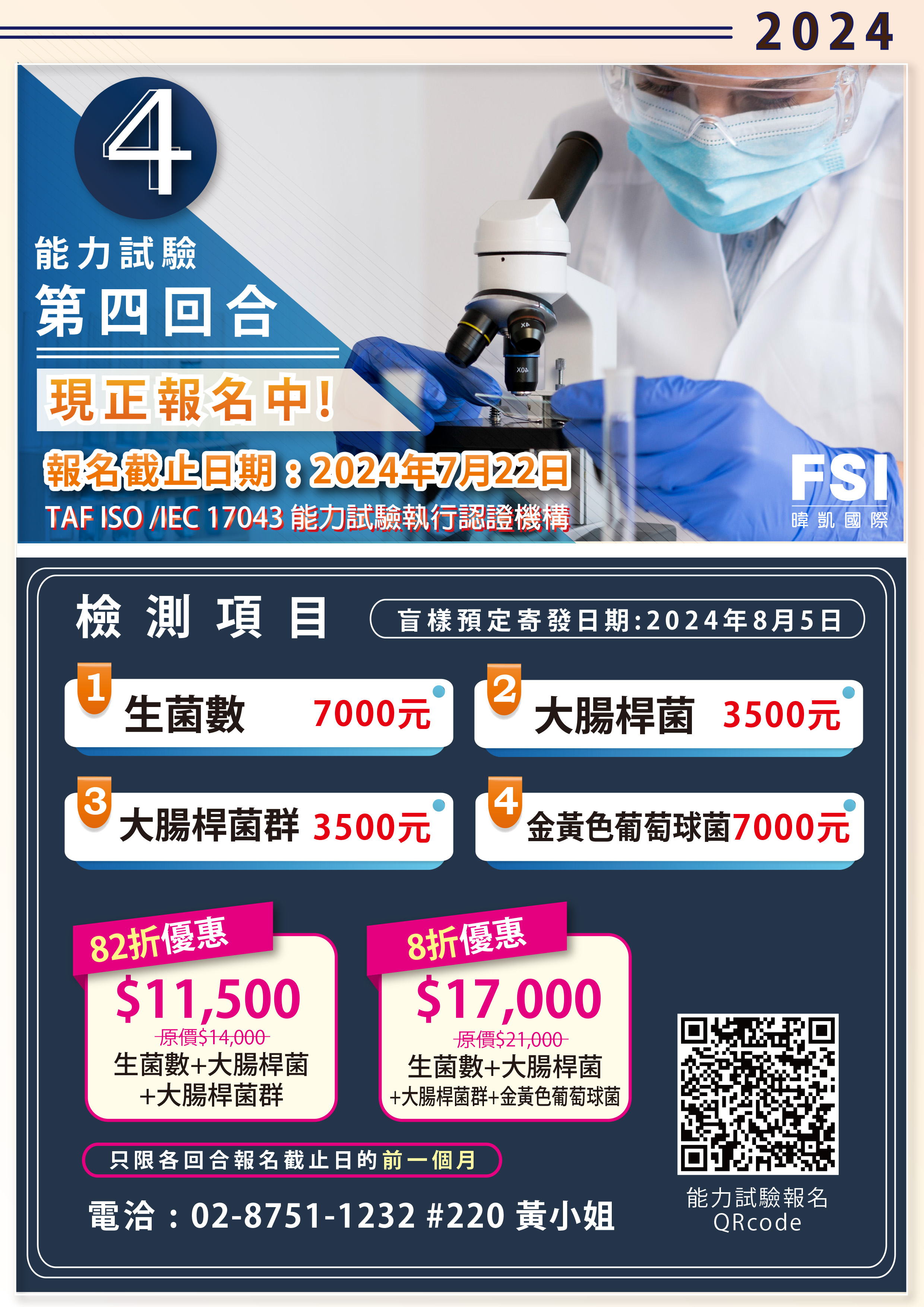 | 2024-06-07 | 2024年度 能力試驗第四回合:生菌數+大腸桿菌+大腸桿菌群+金黃色葡萄球菌 熱烈報名中! |