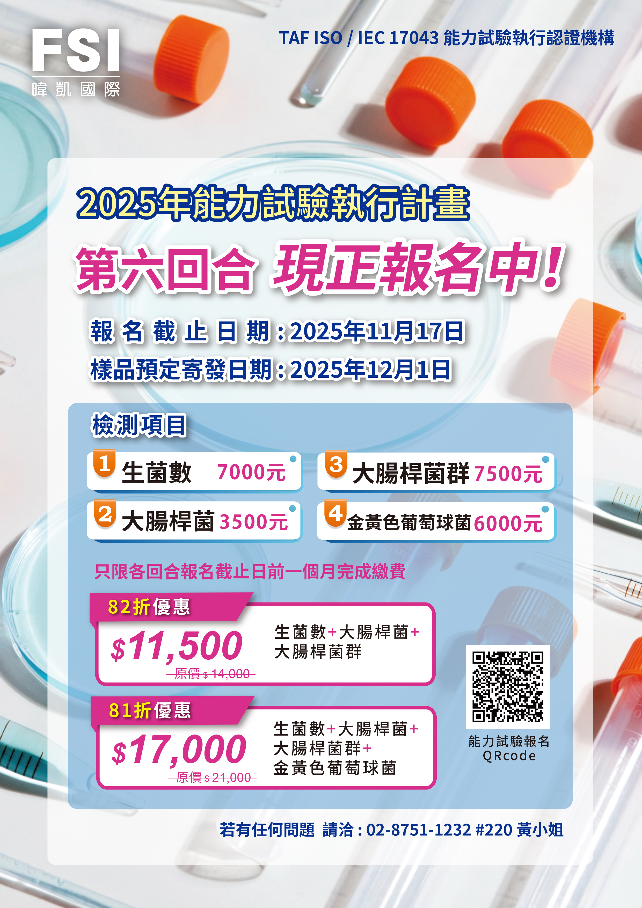 2025年 能力試驗第六回合:生菌數+大腸桿菌+大腸桿菌群+金黃色葡萄球菌 熱烈報名中!