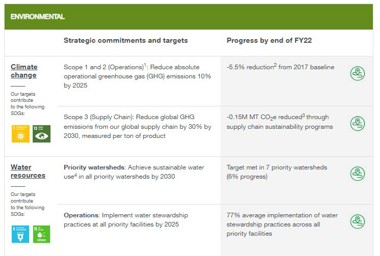 美國各大企業所推動永續政策 美國Aviagen公司,他們揭露他們品系的現代雞產生的碳足跡,比1970年的減少50%,預計到2030年,肉雞產生的碳足跡將比今天的肉雞減少約15%。 不同的公司採取減碳的方向不同,要知道每個產業或公司排出多少CO2eq(Carbon dioxide Equivalent)要先做碳盤查、碳盤查分為主要3個範疇: (1)直接排放:指公司所擁有或控制的排放源,來自製程或廠房設施,以及交通工具的排放;(2)間接排放:指公司自用的外購電力、熱或蒸氣等能源利用的間接排放;(3)其他間接排放:為公司外部產生的所有間接排放,包含員工通勤或商務差旅,以及產品生命周期所產生的排放。美國有的公司除了自己做碳盤查之外,也在供應鏈施力形成價值鏈。 1.CARGILL 嘉吉公司(Cargill, Incorporated) 是美國最大(以2021年的年營收論)的私人跨國企業,主要事業是食品加工,版圖現已擴大至醫藥、金融、天然資源等(圖一)。其中表示出它們設定了各項目標,有橘色的進行中、綠色的有達標、紅色的再努力,還有藍色的新目標。我們可以看到在7號乾淨能源及13號氣候行動,並且設定2025年前上述(範疇1&2)的碳排放要降低10%,2030年前範疇3的碳排放要降低30%,其他還有6的水保育15的保育陸上生態2030年前要停止砍閥森林。 ![]() 來源:https://www.cargill.com/sustainability/esg-scorecard) 圖一 2022年ESG報告 2.JBS總公司 是世界上最大的肉類公司,總部位於巴西,但它在20多個國家/地區擁有450多個設施和辦事處。JBS也揭露它們主要排放源來自範疇3,他們所採取的方案是減少直接排放:到2030年,JBS以2019為基準年將全球範疇1(直接排放)和範疇2(與購買能源/燃料相關的排放)排放降低至少30%,到2040年,設施中使用100%可再生電力(2030年為60%)。消除森林砍伐2025年前消除供應鏈中的非法亞馬遜森林砍伐,包括其牛事業的二級供應商,並在2030 年之前消除巴西其他區的非法森林砍伐。2035年之前在其全球供應鏈中實現零森林砍伐。